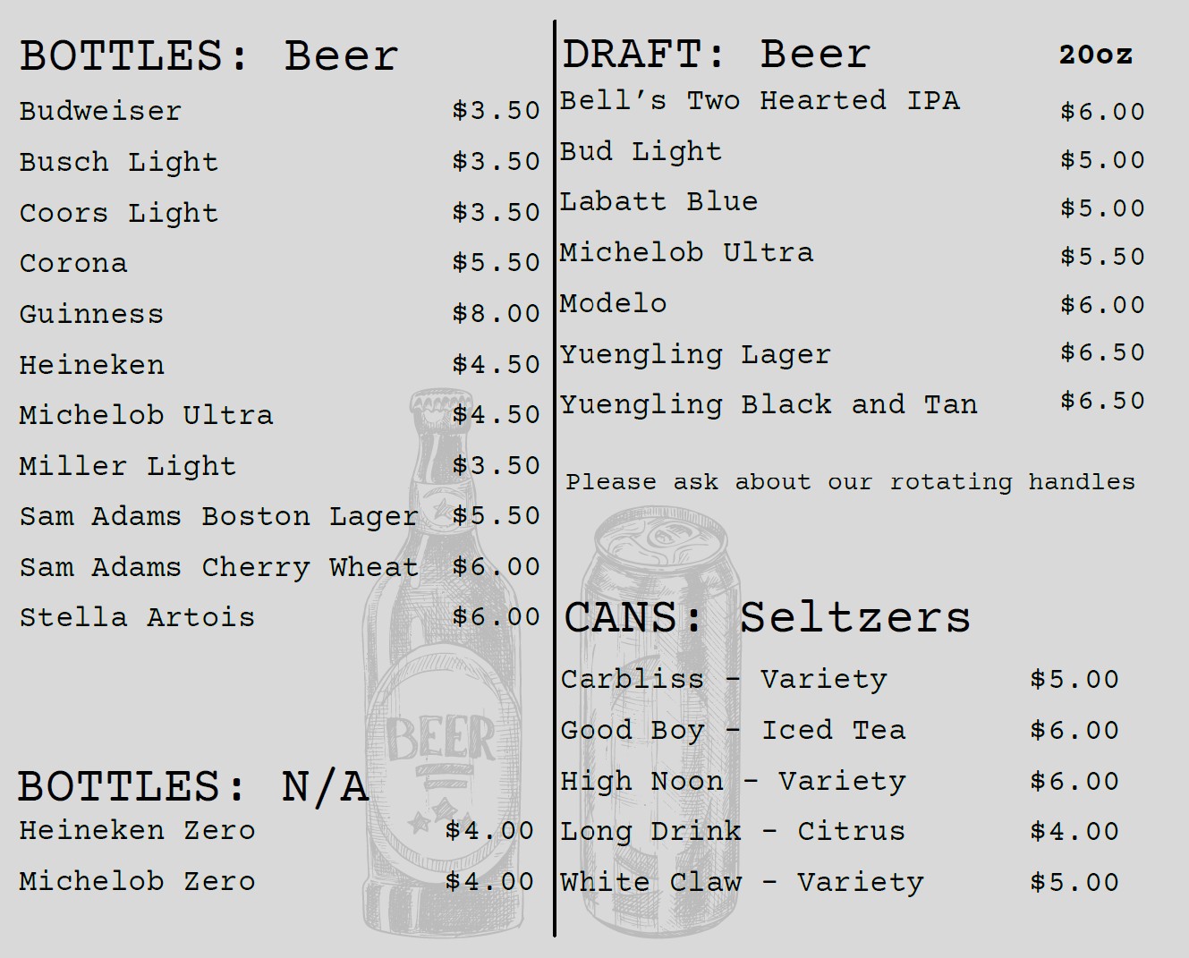 Menu items and prices may change. The printed menu at the restaurant reflects the most current offerings and pricing.